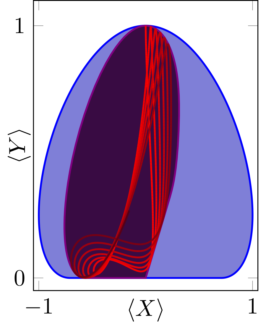 Here, the unconstrained set of possible expectation values is shown in blue; the shadow of the orbit $\exp(-iH t) \ket\psi$ is shown as a red curve, and the set of possible correlations achievable with this dynamics is shown in purple – it is determined using the method sketched above, without the need to calculate the orbits to infinity.5