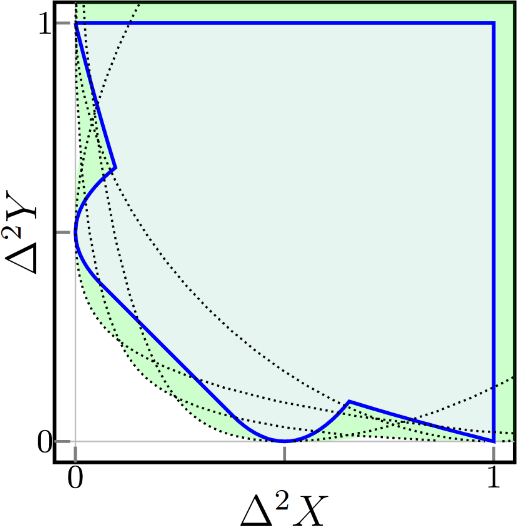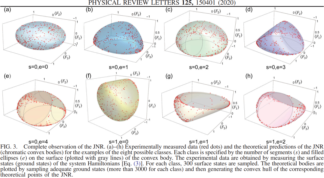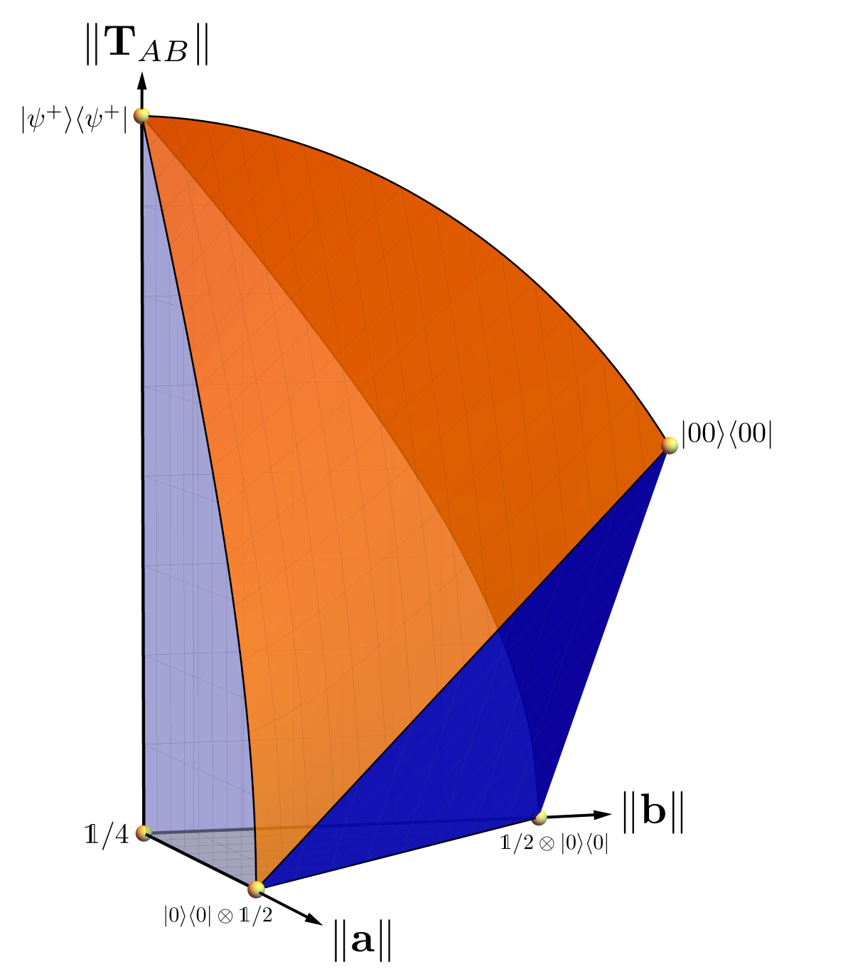 $$\{{\cblue(\langle X\rangle, \langle Y\rangle, \langle Z\rangle)_\rho} : \Tr \rho=1, \rho\succeq 0\}\\=\left\{{\cblue \vec r}\in\mathbb{R}^3 : \lvert {\cblue \vec r}\rvert\le 1\right\}.$$Higher-dimensional analogues much more complex.